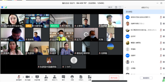 深圳市洁净行业协会副秘书长李海燕,战略发展部部长陈万略,新闻部肖辉,主编单位深圳市华剑建设集团股份有限公司以及参编单位代表、评审专家组共20人参加本次视频评审会。