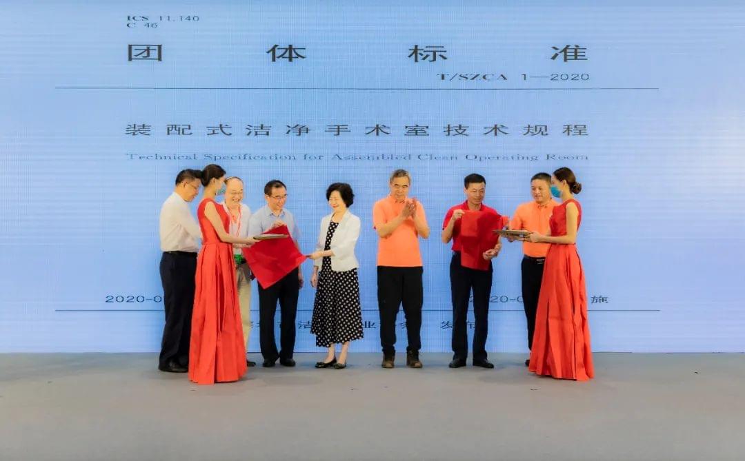 华剑股份的叶剑彪董事长在标准的预发布仪式上,充满深情地吟诵到:秋风明月闻喜鹊,难忘专家彻夜忙,感恩政府高瞻践,洁净人民喜万家。为贯彻落实国家关于《大力发展装配式建筑的指导意见》和《十三五装配式建筑行动方案》等产业政策的要求,由华剑股份牵头主编的《装配式洁净手术室技术规程》专著(规程编号:T/SZCA 1-2020), 在行业专家、兄弟单位的支持和参与下,历经一年多的时间,几易其稿,最终圆满完成了任务。在整个编写过程中,华剑股份派出了,深耕医疗建设领域多年的顶级,技术团队,结合公司的丰富实践经验,理论联系实际,使规程的内容,既有战略指导意义,也有实际操作指针,集战略性和操作性于一体,代表了本行业的最高水准。主要审查人员许忠麟教授是中国洁净领域泰斗级人物,老人家亲力亲为,亲自参与每一次的标准研讨会,亲自校对每一个措辞,对于本部标准作出了巨大的贡献。这一专著的出台,顺应了国家对装配式建筑的发展要求,使我们深圳洁净行业的发展,又一次走在了全国的前列。论坛上举办了标准的预发布仪式!