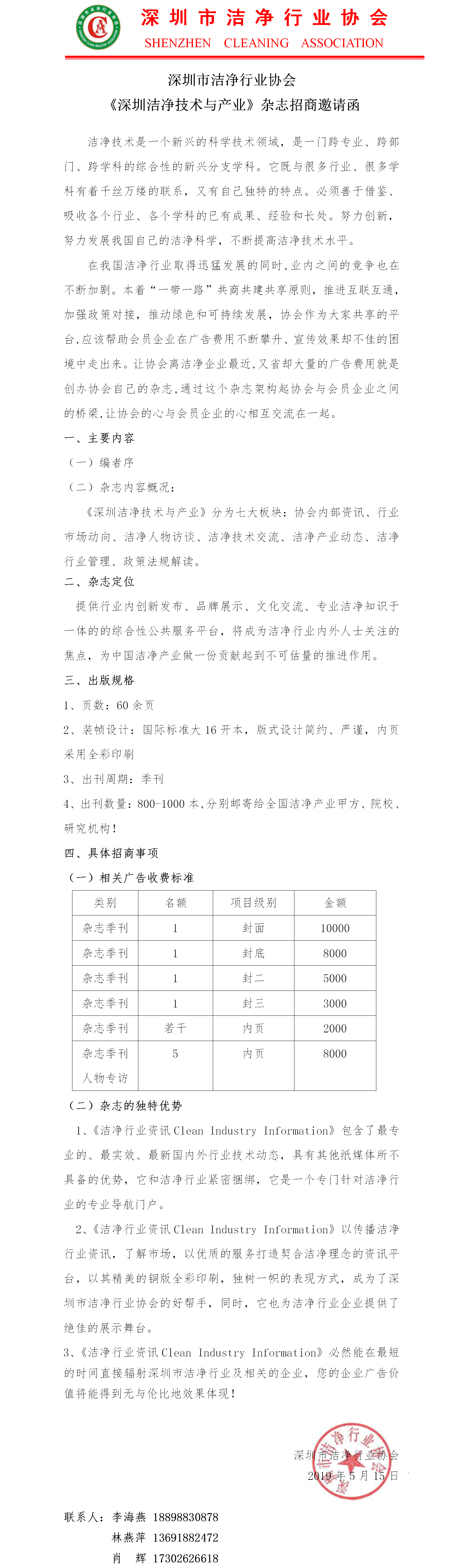 深圳市洁净行业协会 《深圳洁净技术与产业》杂志招商邀请函