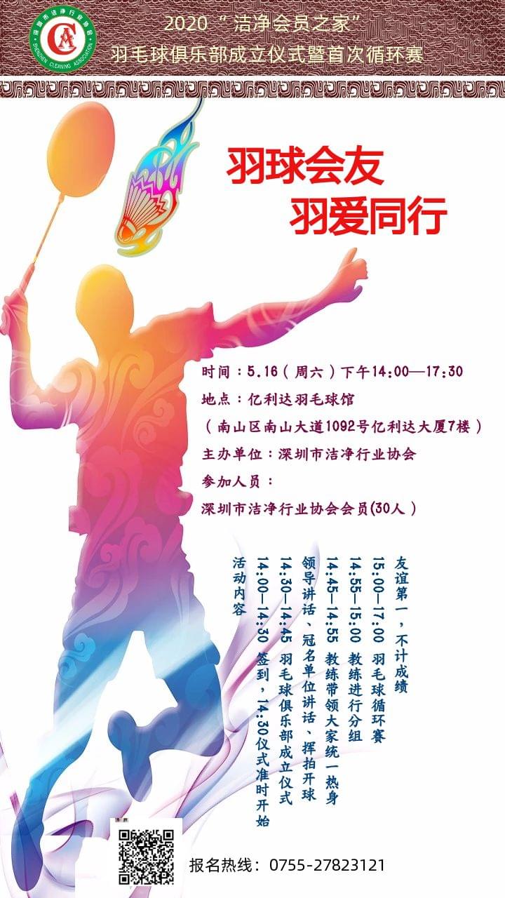 运动的汗水洗尽生活的烦恼,强健的体魄创造明天的幸福!为丰富洁净会员们的业余生活,增强体质,加强会员之间的交流,持续营造“洁净会员之家”的温馨、积极、健康向上的氛围,经秘书处决定举办2020“ 洁净会员之家”羽毛球俱乐部成立仪式暨首次循环赛。时间:2020年5月16日(本周六)下午14:30-18:30