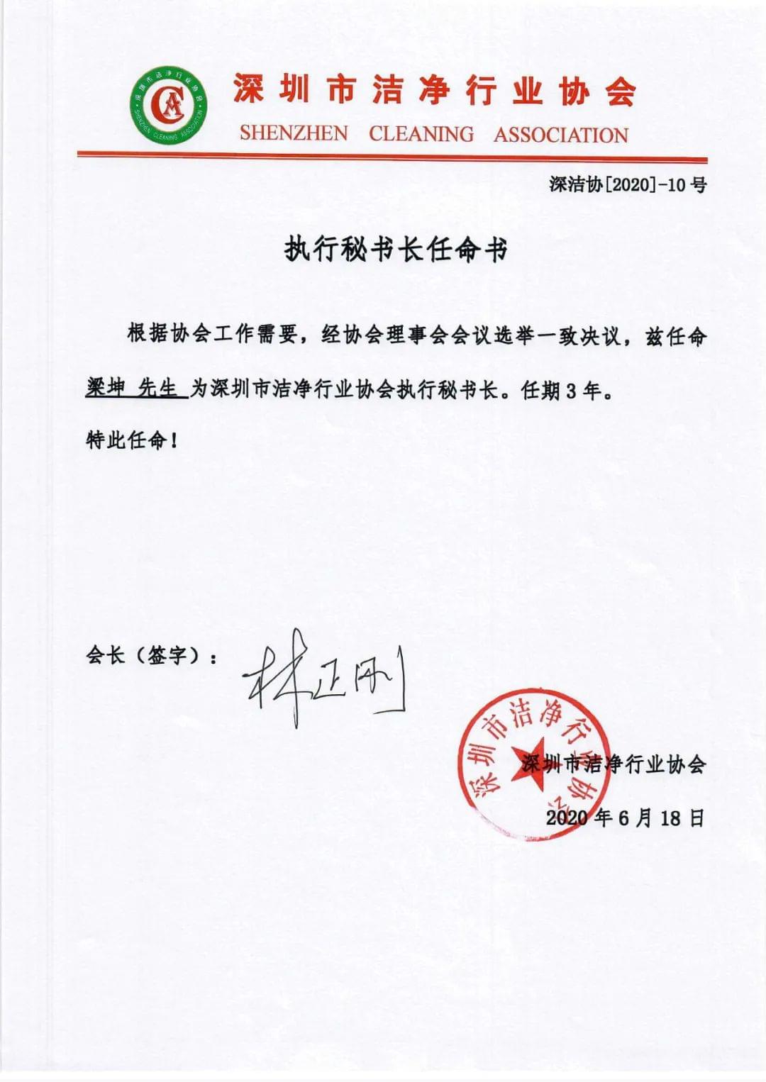 根据协会工作需要,经协会理事会会议选举一致决议,兹任命 梁坤先生 为深圳市洁净行业协会执行秘书长。任期3年。