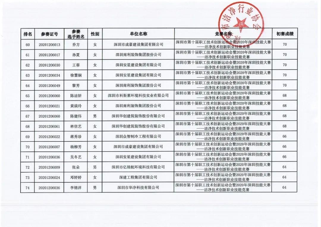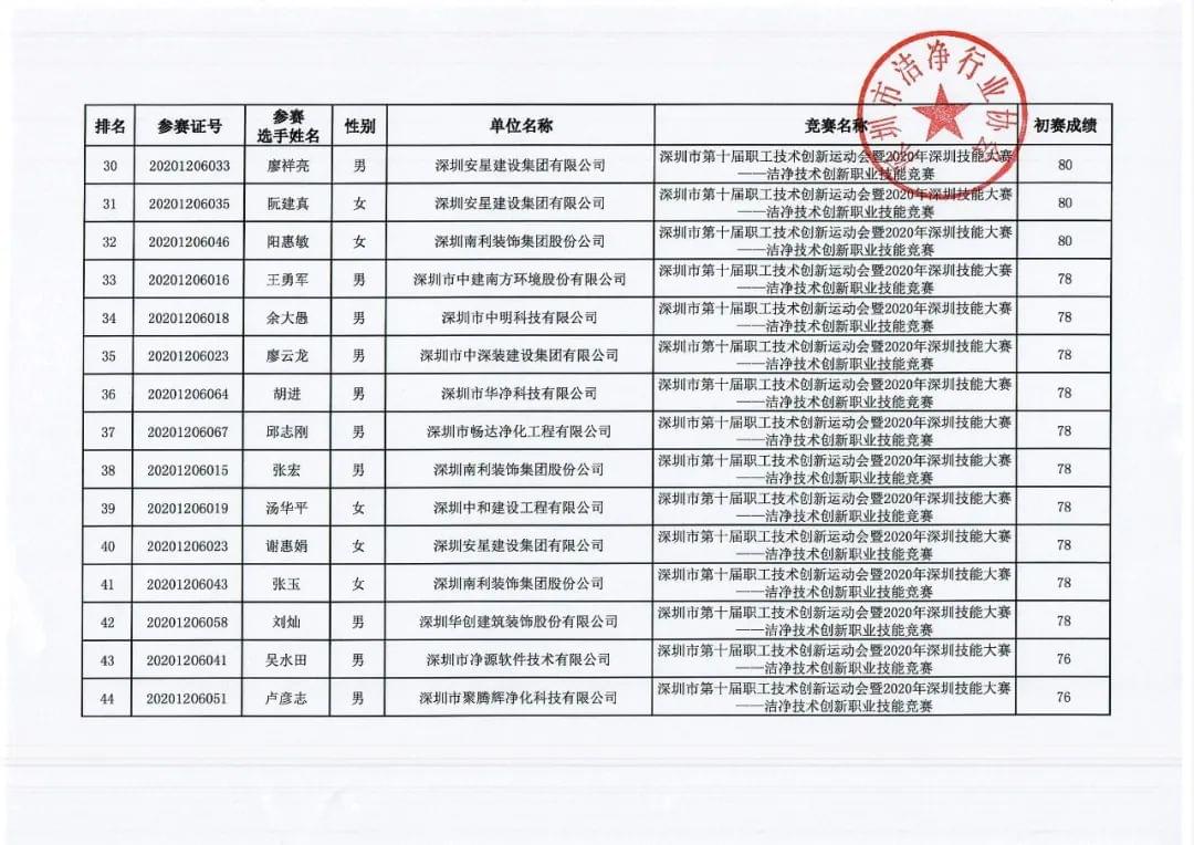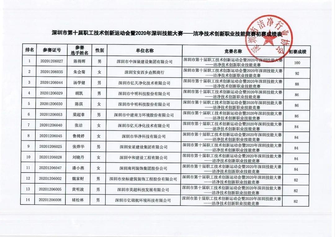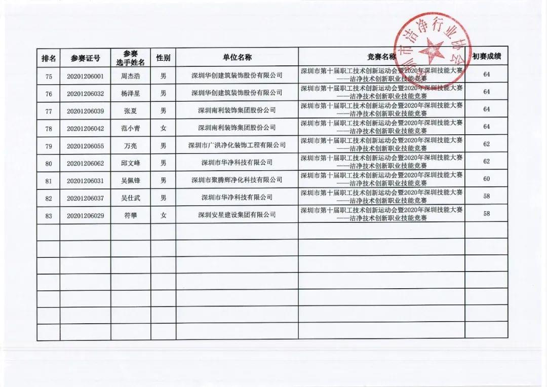 深圳市第十届职工技术创新运动会暨2020年深圳技能大赛——洁净技术创新职业技能竞赛初赛成绩公布