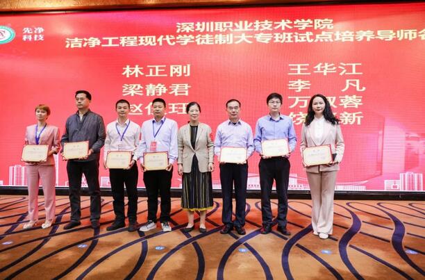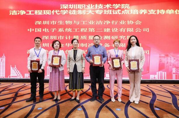 我会携手深圳职业技术学院开办的洁净行业三年全日制大专班,为了培养定向优秀人才,中国电子系统工程第二建设有限公司等优秀企业派出人员任专业讲师,进行专业课程教学任务,在本次会议上,深圳职业技术学院工程学院陈红院长为他们颁发了洁净大专班支持单位牌匾及专业导师聘书。