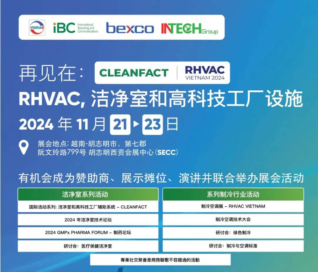 CLEANFACT & RHVAC VIETNAM 2024是由国际品牌与传播股份有限公司(IBC)、INTECH集团、越南制冷空调科技协会(VISRAE)和韩国釜山会展中心(BEXCO)共同举办的年度专业展览会,涵盖制冷、加热、通风、空调(RHVAC)、洁净室技术和高科技工厂支持领域。这是该领域规模最大的年度活动之一,汇集了来自国内外的众多企业,展示专业产品和解决方案。预计展会将吸引来自越南、韩国、中国、日本、印度、欧洲、美国等多个国家的7000多名参观者,包括知名品牌和企业。