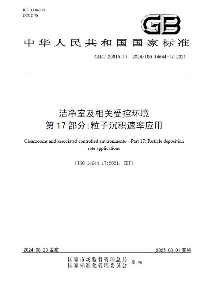 《洁净室及相关受控环境 第17部分:粒子沉积速率应用》国家标准发布
